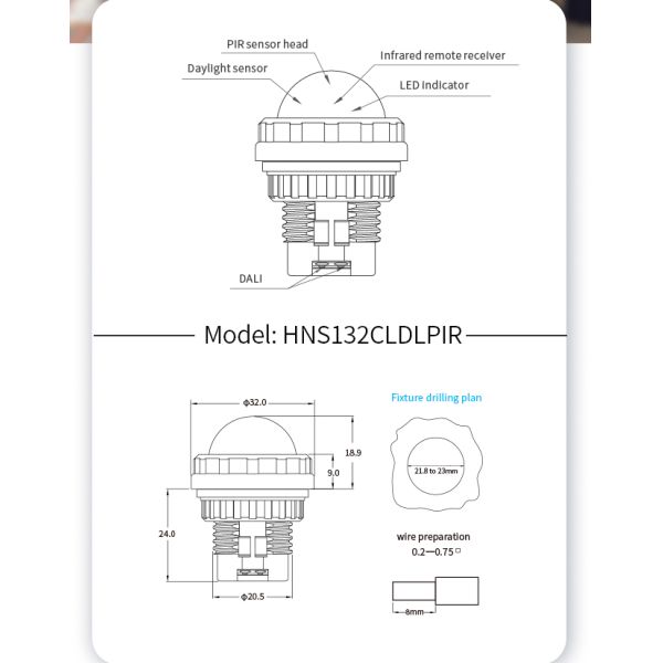 | 4 | PIR+Daylight sensor+DALI | HNS132CLDLPIR | 9.5-22.5V DC, DALI output, tri-level dimming and constant lux function, remote control and DALI BUS setting | ||
